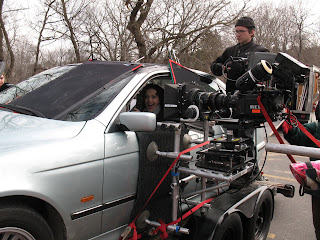 4. OR, you could use a long lens from a fixed tripod position and have the vehicle drive in circles around the camera. The idea being that the camera only pans left to right in complete circles while the vehicle drives in a larger circle around it. The long lens would help blur your background so that the audience wouldn't be able to tell that the car wasn't really driving straight down the road. Of course, there are potential camera-operating issues with this idea, so it isn't the best solution.